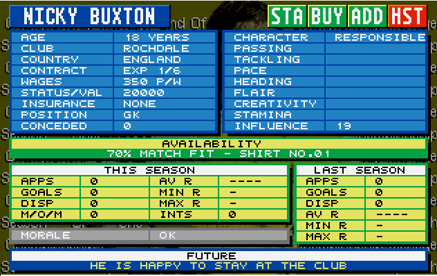 Starting in division 3, squad looks ok, good balance of D/M/A, particularly Paul Williams DMA L. But there’s no ‘keeper! I always try and use different players for each save, not always going for the usual suspects, so a request for recommendations goes out on Twitter and the first signing is Nick Buxton (who promptly gives us a follow! @buccono1 Thank you!)