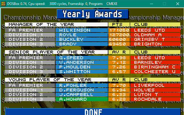 We secure promotion with a good few games remaining and finish 22 points clear of Cambridge (who have a great squad and are now pencilled in for a future save) and Brighton (who win the playoffs to join us in Division 2). No surprise Danny Carter is fans Player of the Year with highest average rating and most MoM’s, as Aston Villa win the Premier League, ahead of Newcastle, and the League Cup and Leeds Utd take home the FA Cup, again with Newcastle runners up! Plymouth drop out of the football league and Shilton gets the sack, to be replaced by Telford United!