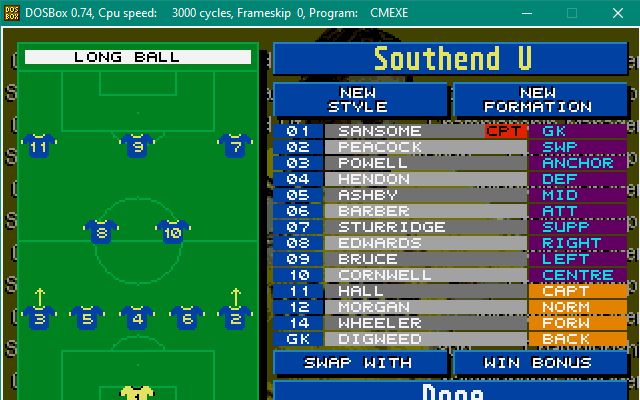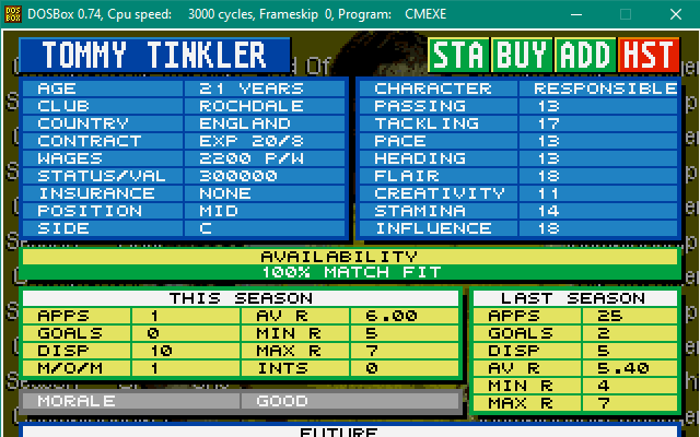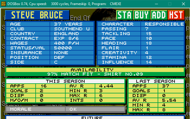 At the other end Liverpool are fighting back but still in the relegation zone, and at the very foot of the league tables, Southend look like they’re heading out. No surprise with their ageing squad, and their insistence on playing Steve Bruce, yes THAT Steve Bruce, as their main striker and target man! Previous seasons humourous regen Tommy Tinkler is at Southend too, and their best average rated player, so we do the right thing and save him from oblivion!