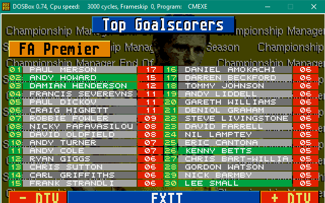We come back from the defeat to beat Man Utd, so at the halfway point we’re 9 points ahead of Tottenham now who have caught up Arsenal too, having been 15th after 7 games, and are ahead of them by 3 points, Spurs Craig Hignett is just ahead of Betts and Howard in the ratings. Merson is top scorer so far, Howard and Henderson close behind with Betts and Small way behind following their injuries.