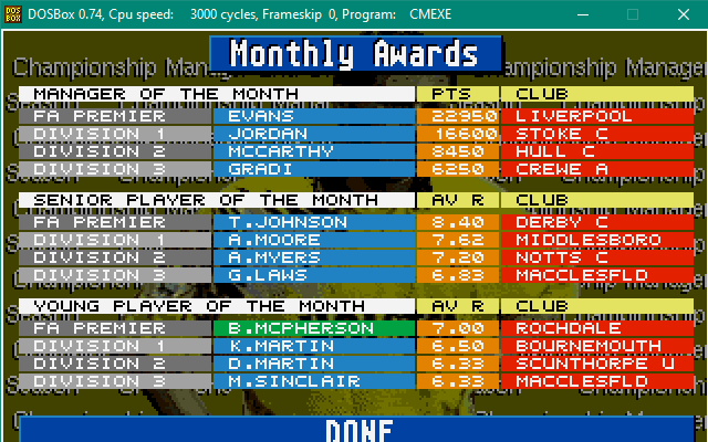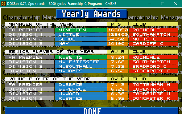 In Division 1 it’s been all over the place, Grimsby and Southampton have been 1st and 2nd for most of the season, but a terrible run of form, winning just 1 of their last 8 games sees them drop out of the playoffs completely, as Southampton almost throw it away too in the last few games, just scraping into the playoffs. They make amends for the two previous seasons choking, this time winning the playoff final to return to the Premier League, along with Nottingham Forest who had a great run in and Bournemouth who steadily climbed to the summit and take the title. Chelsea unsurprisingly are stone cold last and go down with Tranmere and Brentford.