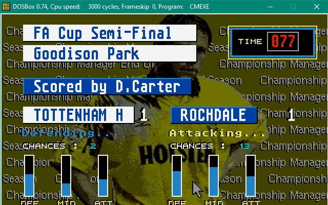 We travel to Goodison park to face Tottenham again in the FA Cup Semi with a full squad and dominate the early exchanges, having a string of chances and a goal disallowed, but get sucker punched by Jan Age Fjortoft who sends us in 1-0 down at the break. We keep going at them in the second half and get our reward as Henderson gets the equaliser, and in the 77th minute Carter goes clean through and scores to send us to Wembley again where we’ll face West Ham!
