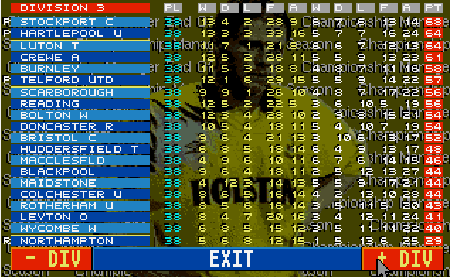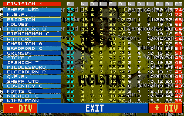 Sheffield Wednesday make an immediate return to the top flight winning division 1, joined by W.B.A. and Peterborough who managed to stay in the playoff spots for the majority of the season and deservedly win the playoff final. Norwich Notts County and Wimbledon all drop down to Division 2. Northampton who re-joined the league a few seasons back go down by 11 points. We rescued their most promising player, Paul Chamberlain, just before the transfer window shut and hope he’ll do well next season.